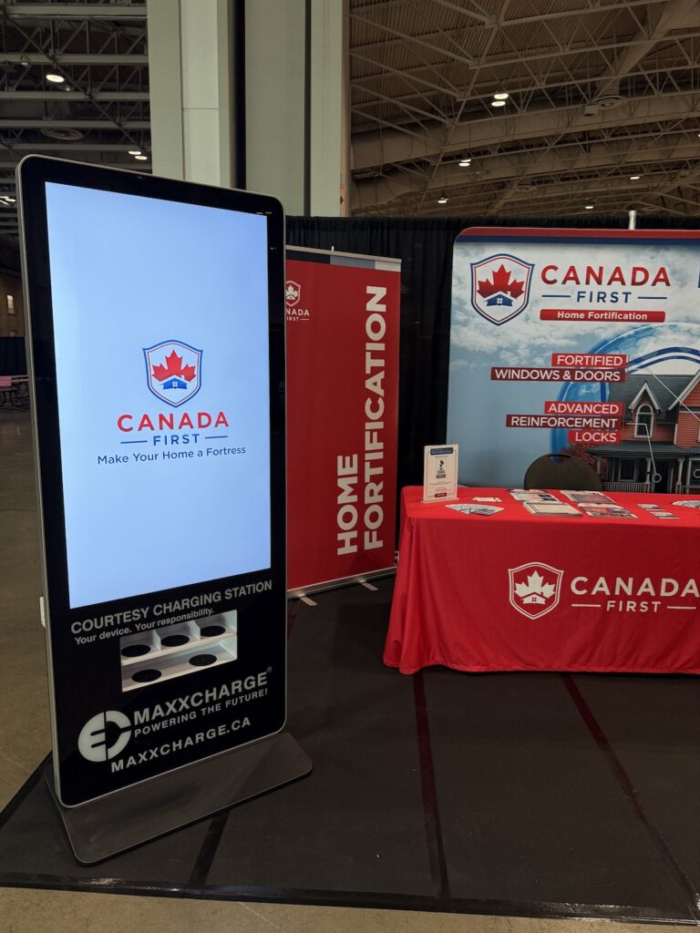 We were excited to be part of the Toronto Fall Home Show supporting Canada First, an industry leader in home fortification, with one of our 55” screen charging stations. The station not only kept guests powered up but also drew in attention with its captivating video display, stopping attendees in their tracks.